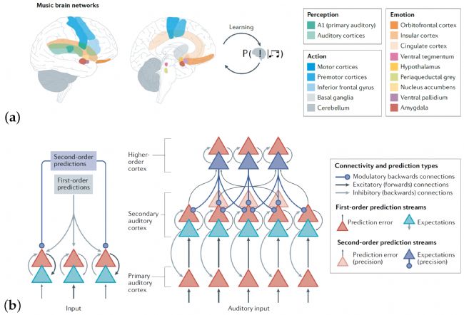 圖5. 音樂通過幾個不同的區域和相關網絡影響大腦。(a)不同解剖區域與音樂感知的關聯概述。(b)音樂預測編碼(PCM)模型