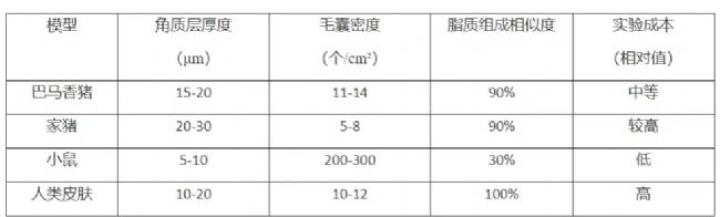 巴馬香豬皮膚因角質(zhì)層厚度(15-20μm)、毛囊密度(11-14個(gè)/cm²)及脂質(zhì)組成(神經(jīng)酰胺含量與人類接近)與人類皮膚高度相似,被推薦為IVPT的“金標(biāo)準(zhǔn)”模型。其藥物滲透率與人體數(shù)據(jù)的相關(guān)性(R²可達(dá)0.85-0.95)顯著優(yōu)于小鼠等其他動(dòng)物模型。 其優(yōu)勢(shì)不僅體現(xiàn)在科學(xué)準(zhǔn)確性上,還兼顧了實(shí)驗(yàn)可行性和倫理合規(guī)性,是藥物開發(fā)、化妝品評(píng)估等領(lǐng)域不可替代的工具。