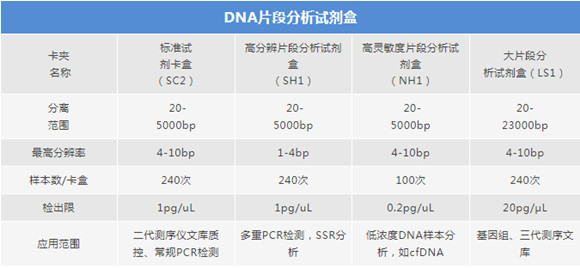 目前有4種片段分析試劑盒適用于GeneCE-100生物片段分析系統,主要用于gDNA、cfDNA、FFPE樣本、PCR產物、打斷文庫等樣本的DNA片段大小和濃度檢測。相較于傳統電泳具有分辨率高、分離速度快、樣本消耗低、檢測靈敏度高及自動化程度高等優點。