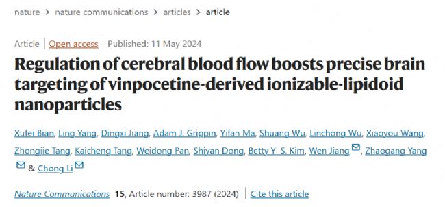 2024年,西南大學李翀團隊從腦血流的調節和長春西汀的結構特征中汲取靈感,開發了一種創新的腦靶向遞送系統,稱為長春西汀衍生的可電離脂質納米顆粒(vinpocetine-derived ionizable-lipidoid nanoparticles, VIP),相關的研究“Regulation of cerebral blood flow boosts precise brain targeting of vinpocetine-derived ionizable-lipidoid nanoparticles”,發表在Nature Communications(IF2023 = 14.7)。