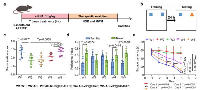 圖2. AD模型小鼠,基于VIP載體的藥物VIP@siBACE1,相比其他藥物載體組顯著提升了AD小鼠物體識別行為測試表現。