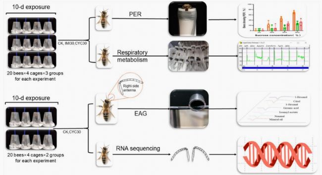 結(jié)果表明,CYC 對(duì)蜜蜂具有很高的毒性,經(jīng)口48h致死量中位為32.8ng/只蜂。在亞致死濃度30μg/L的CYC中長(zhǎng)期暴露10天后,蜜蜂的存活率和食物消耗量顯著降低,蜜蜂對(duì)蔗糖、氣味敏感性,以及個(gè)體呼吸代謝CO2產(chǎn)量顯著降低。此外,分子對(duì)接顯示CYC與氣味結(jié)合蛋白的結(jié)合親和力高于氣味,嗅覺(jué)和代謝途徑基因表達(dá)在轉(zhuǎn)錄組水平上受到負(fù)面影響。