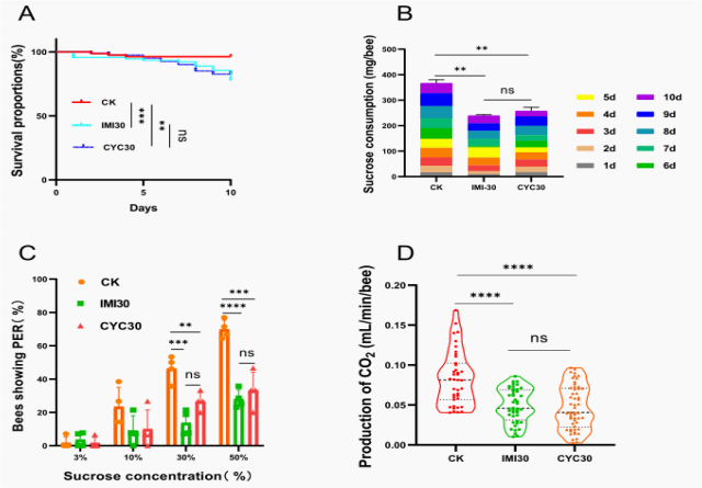 圖為長(zhǎng)期接觸10天后環(huán)氧蟲啶對(duì)蜜蜂的毒性作用。CYC:環(huán)氧蟲啶;IMI:吡蟲啉,陽(yáng)性對(duì)照化合物;A:生存暴露期間蜜蜂存活占比曲線;B:每只蜜蜂累計(jì)消耗50%蔗糖溶液;C:蜜蜂對(duì)不同濃度蔗糖溶液的響應(yīng)速率;D:CYC-或IMI處理后蜜蜂的呼吸代謝能力。