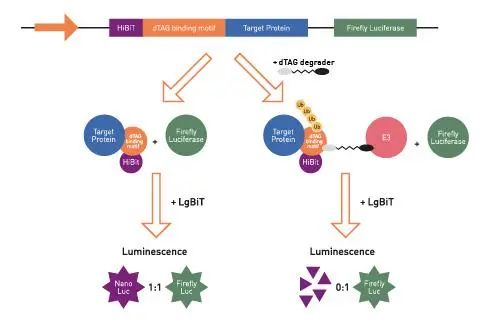 本文所述的dTAG蛋白降解分析使用了雙熒光素酶報告系統來測量靶蛋白降解。為此,使用螢火蟲熒光素酶作為基準標記物,該標記物不應受到dTAG降解的影響。第二種熒光素酶是納米熒光素酶(Nanoluciferase),以碎片化的非活性形式(HiBiT)與靶蛋白融合。dTAG降解劑能夠通過引入的dTAG結合基序,將靶蛋白與E3泛素連接酶結合,從而形成三元復合物(見圖1)。這會導致靶蛋白及其融合的HiBiT片段的泛素化并隨之降解。為了測量納米熒光素酶的熒光發射,在降解后加入LgBiT。這個小的納米熒光素酶片段可以完成未降解的HiBiT片段,進而形成活性納米熒光素酶,產生熒光信號。納米熒光素酶與螢火蟲熒光素酶的發射比值則成為dTAG降解劑效能的指示,比例越低,目標降解程度越高。