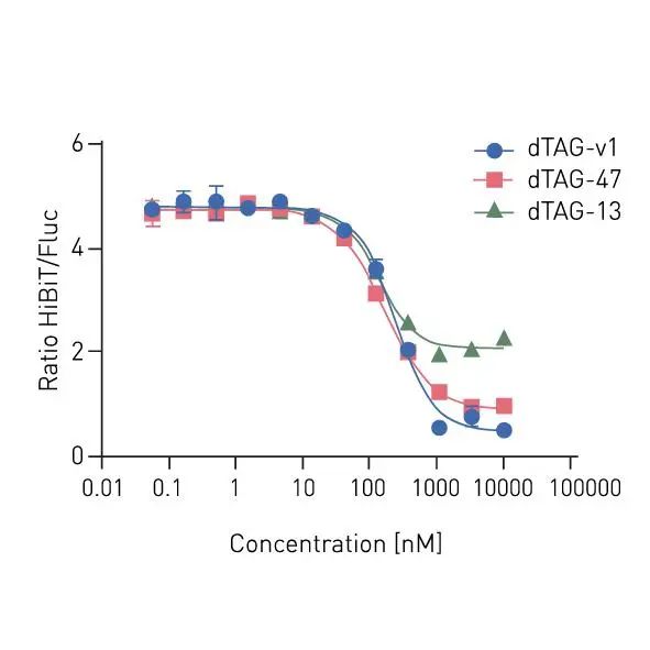 所有測試的dTAG降解劑均以濃度依賴的方式引起了納米熒光素酶發射量的下降(即HiBiT降解)。然而,不同的dTAG分子在HiBiT降解的程度上有所不同。dTAG-13(綠色曲線)引起約50%的降解和納米熒光素酶發射量的減少,而dTAG-v1(藍色曲線)則表現為最強的降解劑,幾乎完全降解了HiBiT。