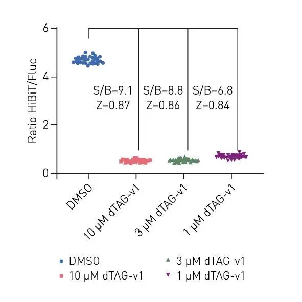 如圖 3 所示,與 DMSO 對照相比,所有三種濃度的 dTAG-v1 均導致 HiBiT 融合蛋白降解。信號與空白比值顯示,納米熒光蛋白化學發光信號隨濃度降低而降低,而 Z 因子為 0.84 至 0.87,表明數據穩定性良好。