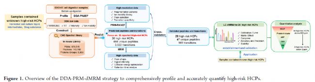 [1],首先通過數據依賴采集(DDA)構建包含所有潛在HCPs的CHO細胞蛋白庫,然后對38種已報道的高風險HCPs進行了平行反應監測(PRM)和多重反應監測(MRM)交叉驗證,最終篩選出28種高風險HCPs及其特異性肽段和離子對信息。下一步建立并驗證了一種新的動態MRM(dMRM)方法,可以同時定量28種高風險HCPs。最后,應用上述策略分析了五個純化的單克隆抗體制備工藝樣品,通過DDA方法對未知HCPs進行全面分析,使用dMRM方法對28種已知高風險HCPs進行快速定量?傮w而言,該策略能夠對已知和未知HCPs進行全面分析,指導生物制藥工藝的優化。本研究中DDA數據分析使用