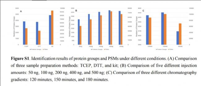 許多研究傾向基于數據非依賴采集(DIA)的方法來檢測HCPs,這樣可以減少低豐度信號的缺失,提高蛋白質組的覆蓋深度,但DIA的譜圖處理更加復雜,也容易受到復雜基質的信號干擾。本研究中,作者選擇了以DDA的方式構建HCPs蛋白質譜圖庫,基于該庫直接生成PRM/MRM離子對列表,可確保工藝開發階段方法的一致性。為確保對低豐度HCPs鑒定的全面性,作者對中國倉鼠卵巢(CHO)細胞提取的全蛋白溶液,采用了兩種不同的酶切方案:自制溶液和EasyPep MS試劑盒。結果顯示,EasyPep MS試劑盒處理的樣本蛋白鑒定更多。最終采用EasyPep MS試劑盒、400ng質譜進樣和150min梯度的方法進行后續實驗(Figure S1)。最終構建了一個包含6863個蛋白質、143166條多肽的譜圖庫,超過了目前已報道的CHO細胞蛋白庫。