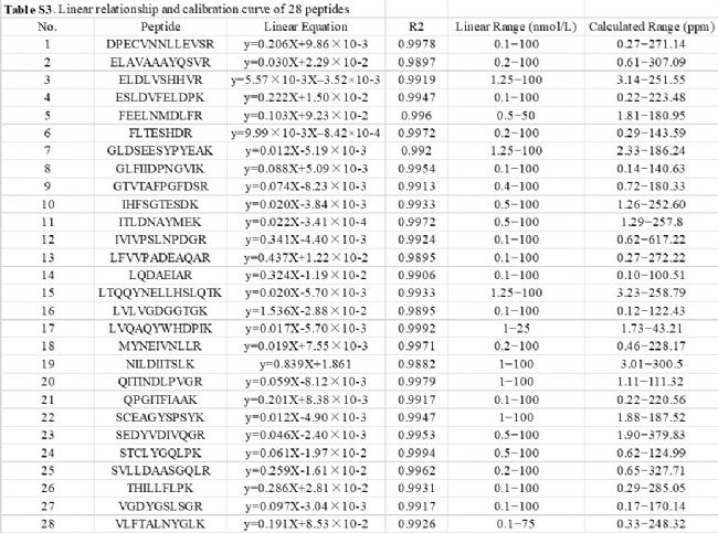 2超過0.98。結果如Table S3所示,10種肽具有良好的線性(0.1 – 100nmol/L),21種肽的定量下限低于1 nmol/L),25種肽的上限達到100 nmol/L。除了LVQAQYWHDPIK的線性范圍較窄外,所有肽均涵蓋了下游純化過程中典型的HCP濃度范圍。此外,作者又在實際條件下對穩定性進行了驗證,包括在室溫(RT)下24小時的短期穩定性、凍融穩定性(從−80°C到室溫的三個凍融循環)以及在4°C下7天的長期穩定性。所有肽在相對誤差(RE)和相對標準偏差(RSD)±15.0%范圍內保持穩定。所有驗證結果均符合中國藥典對生物樣品的標準,這充分證明了該方法對28種高風險宿主細胞蛋白進行精確定量的穩健性,適用于生物制藥過程監測和質量控制。