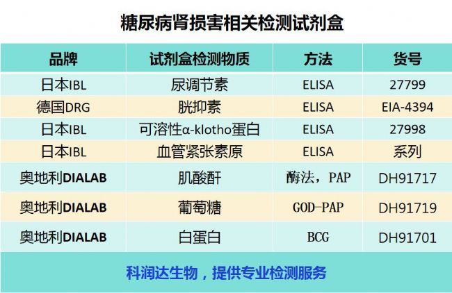 科潤達(dá)生物并有注冊檢驗師帶領(lǐng)的檢測團(tuán)隊,支持全國范圍的科研工作。我們在此向用戶推薦以下糖尿病腎病試劑盒明細(xì):