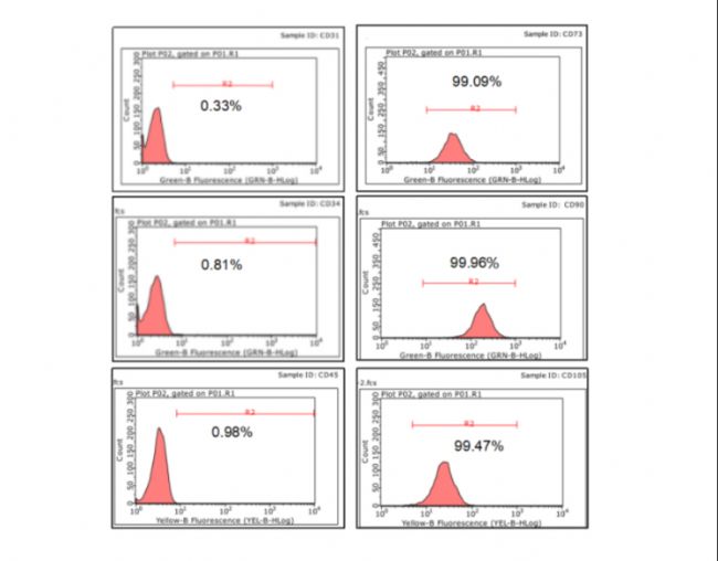 埃澤思增強型人間充質干細胞培養基(hMSC Medium Plus)能夠穩定維持高代次陽性標志物在98%以上。圖為P12代人臍帶間充質干細胞表面標記物的檢測。