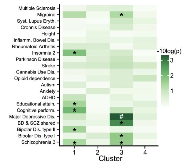 4)通過(guò) LD 得分富集分析發(fā)現(xiàn),增強(qiáng)子富集簇(cluster3) 與重度抑郁癥等神經(jīng)精神疾病的 GWAS 遺傳變異顯著關(guān)聯(lián)(p<0.05),支持膠質(zhì)細(xì)胞調(diào)控異常在神經(jīng)精神疾病中的作用。