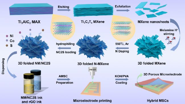 ▲圖1:用于噴墨打印的3D褶皺N-MXene/NiCo2S4的制造示意圖,以及HMSC的組裝過程