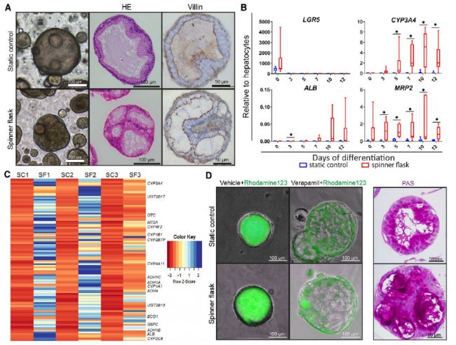 圖2. 攪拌式培養瓶中類器官向功能性肝細胞的分化。類器官在攪拌式培養瓶或靜態對照組中分化12天。