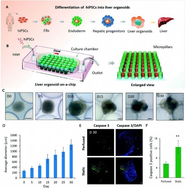 圖3. 使用簡易三維灌注芯片系統實現hiPSCs原位生成肝臟類器官的示意圖及芯片系統中hiPSCs分化為肝臟類器官的特征分析。