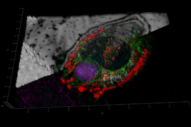 哺乳動物細胞顯示Hoechst(藍色,細胞核),Mitotracker Green(綠色,線粒體)、Bodipy(紅色,脂滴)、熒光珠(品紅色,1µm),反射(白色)。比例尺10µm:細胞由德國海德堡歐洲分子生物學實驗室Mahamid團隊的Ievgeniia Zagoriy提供