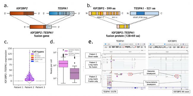 了解癌癥的腫瘤內異質性及其與腫瘤微環境(TME)的復雜相互作用需要單細胞分辨率的基因型和表型信息。在瑞士蘇黎世聯邦理工學院研究團隊的一項研究中,研究者采用10x Genomics平臺進行單細胞捕獲,結合串聯的實驗策略對網膜轉移的卵巢癌患者的腫瘤和癌旁配對樣本進行了基于PacBio全長的單細胞轉錄組測序,共檢測到152,000個轉錄異構體,其中超過52,000個是新發現的轉錄異構體。該研究中,研究人員同時進行了長讀長和短讀長測序,發現兩者單獨鑒定的細胞類型和種類占比都非常相似,并表明通過PacBio的全長單細胞轉錄組測序可檢測到細胞類型特異性轉錄異構體,揭示了腫瘤和間皮細胞中的差異異構體表達,還發現間皮細胞在轉移中部分通過TGF-β/miR-29/膠原軸轉變為癌癥相關成纖維細胞。此外,研究人員通過單細胞全長轉錄組準確識別了融合基因,包括一種新的經過scDNA測序驗證的IGF2BP2::TESPA1融合,該融合在匹配的二代短讀長測序中不僅沒有發現,且被錯誤歸類為TESPA1基因高表達。這是由于二代測序讀長較短,無法跨越和覆蓋基因的融合位點,僅捕獲到了該融合基因的 3' 端融合部分,即 TESPA1 基因部分,從而導致錯誤的分析結果。