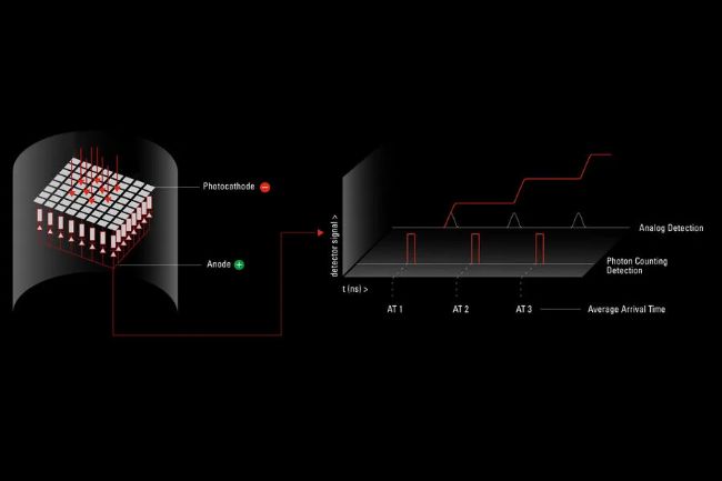 左:示意圖顯示 Power HyD S 探測器的多單元結(jié)構(gòu)。右:在兩種可用工作模式(光子計(jì)數(shù)和模擬)下對(duì)探測器信號(hào)的處理。
