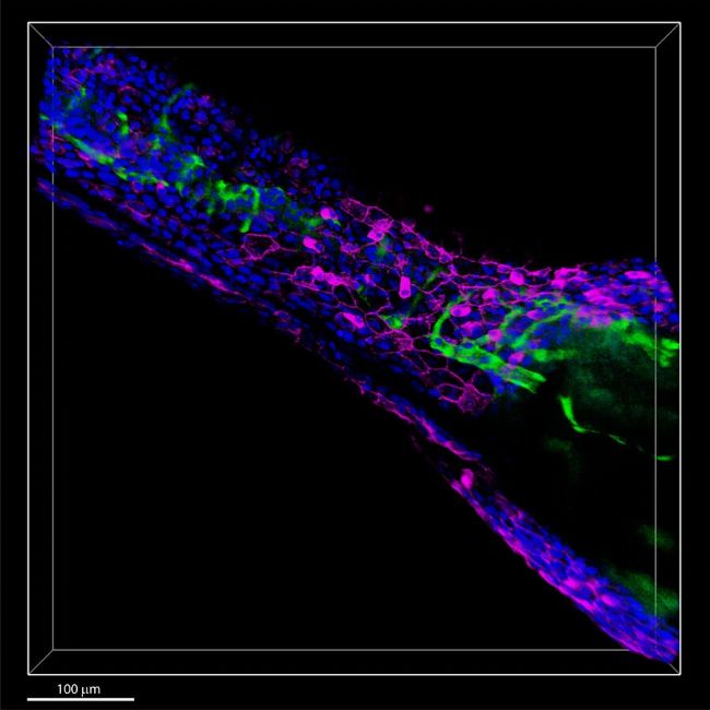 斑馬魚胚胎。 用STELLARIS 8獲得3D圖像,裝配Power HyD S(細(xì)胞核:藍(lán)色,Hoechst)、Power HyD X(內(nèi)皮細(xì)胞:綠色,EGFP)和Power HyD R探測器(細(xì)胞膜:品紅色,NIR750)。 樣本由法國斯特拉斯堡的IGBMC的Julien Vermot提供