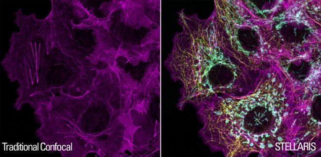 Cos-7細(xì)胞圖像,使用SiR-Actin(657 – 740納米探測范圍)、AF750-Tom20(760 – 790納米)、AF790-Tubulin(810 – 850納米)標(biāo)記。 樣本由蘇黎世大學(xué)的Jana Döhner和Urs Ziegler提供。 左: 使用傳統(tǒng)的GaAsP探測器。 右: 使用STELLARIS 8。