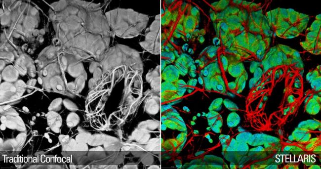 用WGA-CF488染料標(biāo)記的海拉細(xì)胞。 左: 傳統(tǒng)的光子計(jì)數(shù)結(jié)果;右: Power Counting的結(jié)果。 圖中為Z-stack的最大強(qiáng)度投影,用12kHz共振掃描儀獲得,用LIGHTNING處理Power HyD S探測器是STELLARIS的新核心部分。這些硅基多像素光子計(jì)數(shù)器(MPPC)探測器是徠卡顯微系統(tǒng)多年工程設(shè)計(jì)經(jīng)驗(yàn)的成果。這一增強(qiáng)的圖像質(zhì)量樹立起共聚焦成像新標(biāo)準(zhǔn)。