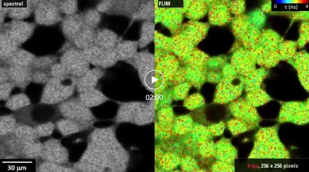 用凝血酶活化肽刺激后的鈣振蕩。 單個(gè)細(xì)胞中的響應(yīng)被記錄為壽命變化。 視頻以4 pfs速率拍攝。 圖像大。 256 x 256個(gè)像素。 顏色條的尺度(壽命):ns。 由荷蘭阿姆斯特丹癌癥研究所的Kees Jalink和Bram van den Broek提供。