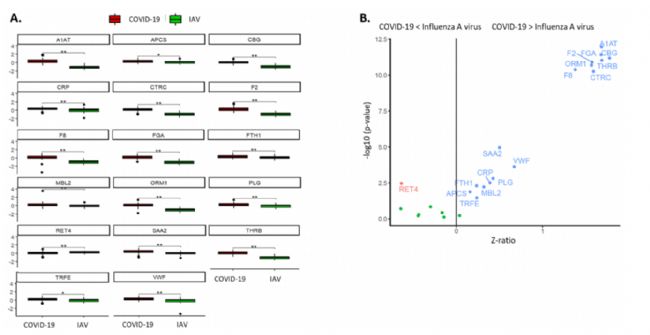 圖 2. 對(duì) COVID-19 和流感患者急性期反應(yīng)物進(jìn)行評(píng)估。A. 比較兩種病毒感染的各急性期反應(yīng)物的箱線圖(p 值:* < 0.05;** < 0.01)。紅色代表 COVID-19 樣本,綠色代表流感樣本。y 軸表示 z 分?jǐn)?shù)。B. 急性期反應(yīng)物顯著變化的火山圖(p 值 < 0.05)。藍(lán)色代表在 COVID-19 患者中升高的急性期反應(yīng)物,紅色代表在流感病毒感染中升高的急性期反應(yīng)物,綠色代表無顯著變化。x 軸表示 Z 比率,y 軸表示 -log10(p 值)。