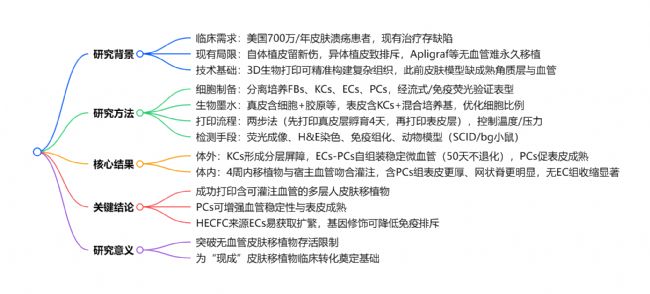 突破了現(xiàn)有無血管皮膚替代品的存活限制,為慢性皮膚潰瘍的永久治療提供新方案,同時為“現(xiàn)成”(off-the-shelf)生物工程皮膚的臨床轉(zhuǎn)化奠定基礎(chǔ)。