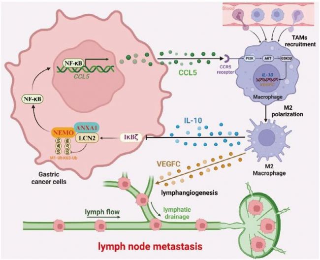 在胃癌(GC)患者群體中,淋巴結(LN)轉移堪稱導致預后不佳的 “頭號元兇”。腫瘤相關巨噬細胞(TAMs)在腫瘤轉移與病情進展進程里扮演著極為關鍵的角色,然而,其究竟如何誘導胃癌發生淋巴結轉移,背后的作用機制至今仍撲朔迷離。