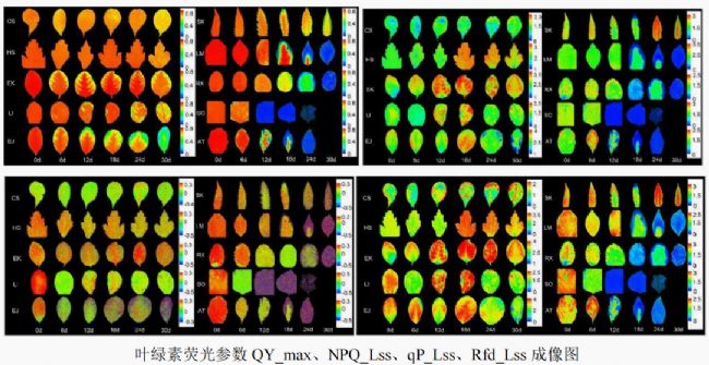 研究中選取了貼梗海棠(CS)、木槿(HS)、膠東衛(wèi)矛(EK)、南陽杜鵑(LI)、日本衛(wèi)矛(EJ)、珍珠梅(SK)、金銀忍冬(LM)、黃刺玫(RX)、紫丁香(SO)、榆葉梅(AT)等十種灌木,通過30天的淹水處理,結(jié)合葉綠素儀與FluorCam熒光成像系統(tǒng),無損監(jiān)測了葉片葉綠素含量與多項(xiàng)熒光參數(shù)的變化。結(jié)果顯示: