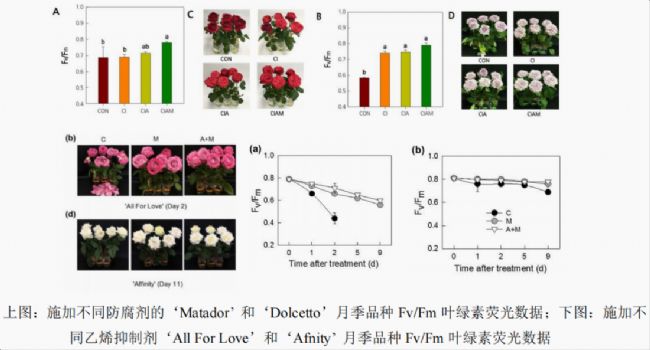 除了觀賞植物育種、脅迫方面的研究,葉綠素?zé)晒獬上襁可應(yīng)用于花卉采后保鮮等領(lǐng)用,用于評(píng)估鮮切花質(zhì)量、保鮮技術(shù)等。鮮切花尤其是鮮切月季在采摘運(yùn)輸過程中,保鮮處理也是非常重要的,而鮮花的保鮮技術(shù)與水果蔬菜又有很大不同。韓國世宗大學(xué)在相關(guān)研究中,對(duì)不同品種的月季施加了各種防腐液與乙烯抑制劑,以評(píng)估最佳的保鮮運(yùn)輸方法。FluorCam葉綠素?zé)晒饧夹g(shù)為鮮花活力評(píng)估鑒定提供了最有力的證據(jù)。