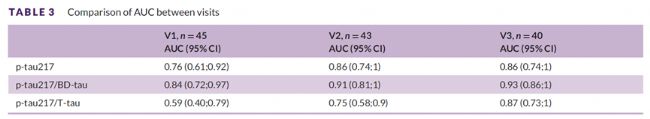 如表3所示,在基于腦脊液p-tau181/Aβ42比值區分Aβ±人群時,p-tau217與p-tau217/BD-tau比值在V1-V3期間的分類性能保持穩定,而p-tau217/T-tau比值波動較大。