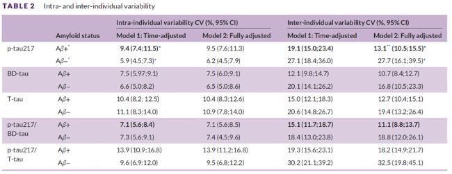 通過線性混合模型計算個體內和個體間變異系數(CV),并評估p-tau217及其與BD-tau/T-tau的比值區分Aβ陽性與陰性個體的性能(AUC)。