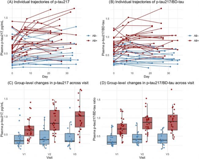 采集了基線(V1)、第4-16天(V2)和第19-36天(V3)的血漿樣本,采用Simoa技術檢測p-tau217、BD-tau和T-tau。