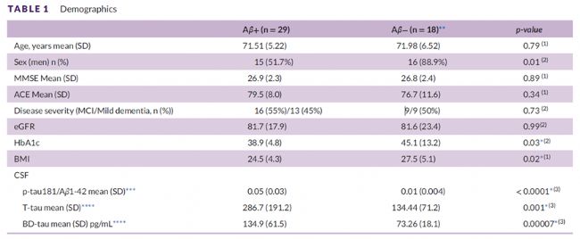 Aβ陽性組與陰性組在年齡、認知損害程度及疾病嚴重程度分布上均無顯著差異,但組間性別分布存在不同——Aβ陰性組中僅有兩例女性患者。基線腦脊液檢測顯示,Aβ陽性組的T-tau與BD-tau指標顯著更高(見表1)。Aβ陰性組的體重指數(BMI)與糖化血紅蛋白(HbA1c)水平顯著更高,其中該組有7例2型糖尿病患者,而Aβ陽性組僅見2例(含1型和2型糖尿病)。
