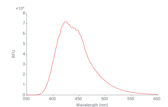 圖 1:使用 SynergyNeo2,設(shè)置激發(fā)光 321nm,掃描 TNS 的發(fā)射光光譜,掃描步進(jìn) 1nm。獲得 TNS 在 DMF 溶液中的熒光發(fā)射光譜,可見在 426nm 處有顯著的發(fā)射峰。