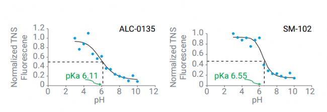 ALC-0135 和 SM-102 是用于 LNP 配方的可電離脂質(zhì)。通過 TNS 測定 pKa 值。圖 2 展示了 ALC-0135 和 SM-102 的 TNS 熒光滴定曲線。結(jié)果表明,ALC-0135 和 SM-102 脂質(zhì)均可電離,其 pKa 值分別為 6.11 和 6.55。