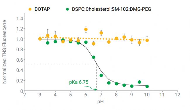酸解離常數(shù) (pKa) 的定義是體系中電離(質(zhì)子化)基團(tuán)和非電離基團(tuán)數(shù)目相等時的 pH 值,因此,LNPs 的表觀 pKa 就是 LNPs 中 50% 可電離脂質(zhì)質(zhì)子化的 pH 值。由于 pKa 決定了納米粒子的電離和表面電荷,這極大地影響了它們的穩(wěn)定性、效力和毒性,也影響了 LNPs 的細(xì)胞攝取、內(nèi)體釋放和生物分布,因此所以,精確測定 LNPs 的表觀 pKa 對于設(shè)計和優(yōu)化 mRNA 藥物非常關(guān)鍵。
