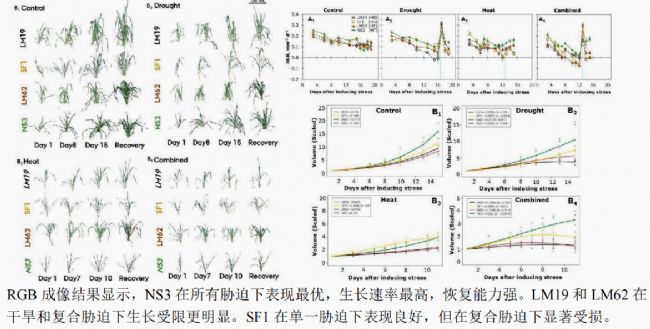 本研究中,根據熱敏感性篩選出四個基因型(熱敏感型:LM19、SF1;熱耐受型:LM62、NS3)。研究人員對分蘗期小麥植株實施四種脅迫處理:對照組、干旱脅迫、高溫脅迫及干旱與高溫聯合作用。干旱處理16天,高溫與復合脅迫均處理11天,之后3天恢復期。通過PlantScreen表型分析系統RGB,對植物在脅迫早期、晚期及恢復期的形態生理特征進行了量化評估。