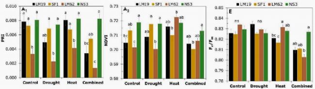 葉綠素熒光成像結果表明,LM19和LM62基因型對后期干旱脅迫更為敏感;熱敏感基因型對于后期熱脅迫耐受性極低;NS3在復合脅迫下仍保持較高的光系統II效率,在單一脅迫階段也表現較強的光合和恢復能力。Fv/Fm在干旱脅迫下無顯著差異,可能是脅迫程度不夠,這與以往干旱研究結論相符