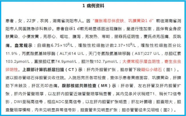 肝片吸蟲對機體的嚴重損害是童蟲在體內移行的階段,主要表現為突發高熱、腹痛、腹瀉和嘔吐等消化道癥狀,肝脾大、貧血和腹水等。如果是持續感染,成蟲在膽管內累積堵塞膽管,則造成急性膽道梗阻,繼而引發腹脹和黃疸等臨床表現,現摘抄膽道梗阻病例病案如下: