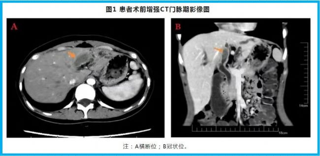 此膽道梗阻病例上腹部CT提示膽總管下小結石如下圖示