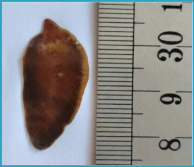 肝片吸蟲的嚴重感染造成了急性膽道梗阻和肝左葉萎縮,醫院進行了肝左葉切除手術并取出8條蟲體。手術取出的蟲體如下圖所示: