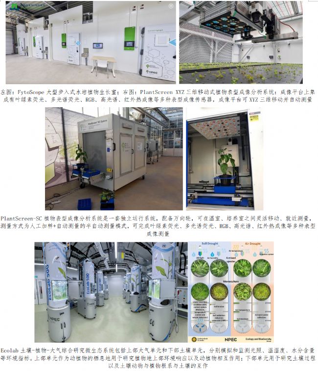 NPEC在幾年時間中陸續建設完成了六大研究模塊,其中包括3套安裝在FytoScope大型步入式水培植物生長室中的PlantScreen XYZ三維移動式植物表型成像分析系統、1套PlantScreen-SC移動式植物表型成像分析系統、36單元Ecolab土壤-植物-大氣綜合研究微生態系統、多套FluorCam葉綠素熒光成像系統等。