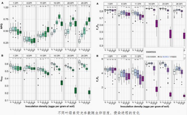 2)高靈敏度: ΦPSII是對低水平侵染最敏感的指標。即使在最低接種密度(5卵/克土)下,從第1天起就能檢測到其下降。而NPQ則在第1天對高接種密度表現出響應。