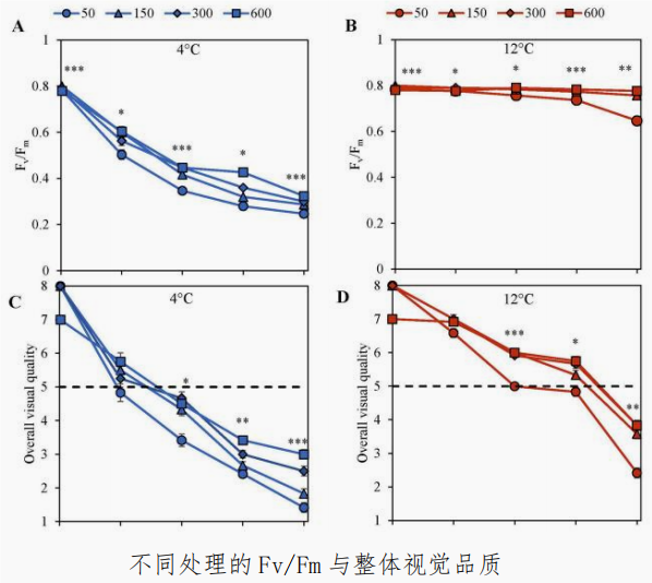 利用FluorCam葉綠素熒光成像系統測量后發現,羅勒葉片最大光化學效率Fv/Fm在4°C貯藏下顯著下降,但EOP光強對其無顯著影響。Fv/Fm反映了植物光合反應中心在脅迫條件下的損傷程度,是目前衡量植物受脅迫程度與抗性高低最靈敏的指標之一。因此,結果表明,EOP高光可有效提升羅勒的營養價值(碳水化合物、迷迭香酸、抗壞血酸),但未能增強羅勒的耐冷性。