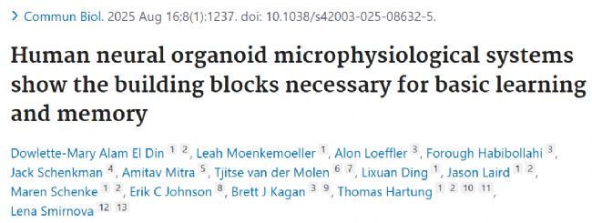 文章的標題為“Human neural organoid microphysiological systems show the building blocks necessary for basic learning and memory”,由美國約翰斯·霍普金斯大學Lena Smirnova教授領導的研究團隊于2025年8月16日在《Communications Biology》(IF2024=5.2)期刊上發表。