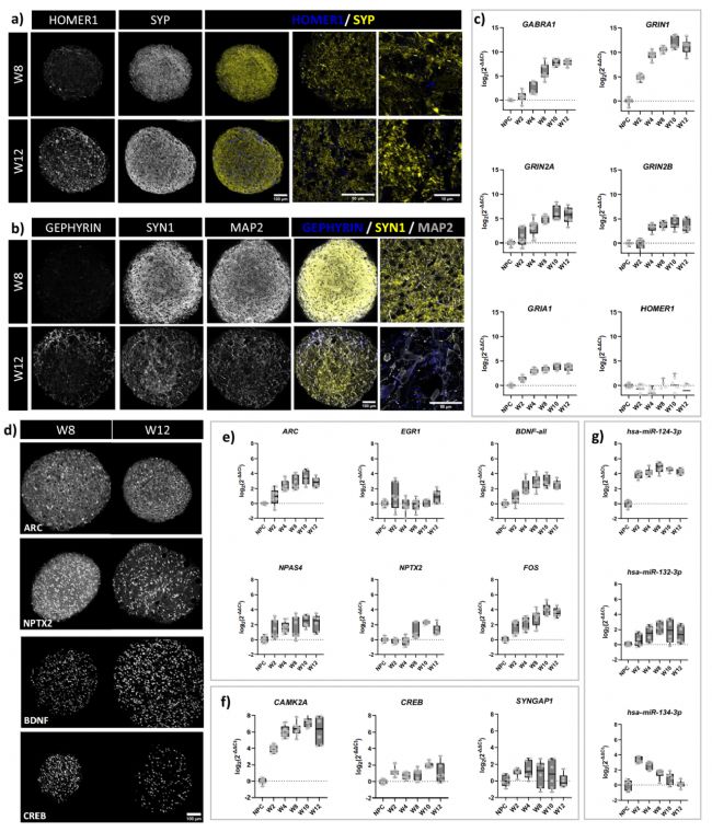 研究通過RNA測序和免疫熒光染色證實,神經類器官在分化過程中逐漸表達關鍵突觸前(如Synaptophysin)和突觸后(如HOMER1)標記物Figure 2)。抑制性突觸標記物Gephyrin在12周時顯著增加,表明抑制性突觸逐漸成熟。此外,谷氨酸能受體(GRIN1、GRIN2A、GRIN2B、GRIA1)和GABA能受體(GABRA1)的基因表達隨時間上升,并在第8周左右趨于穩定,提示類器官在第8至12周達到功能成熟狀態。