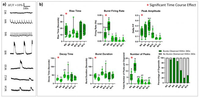 a) 第2–14周類器官鈣信號(ΔF/F)代表性軌跡。