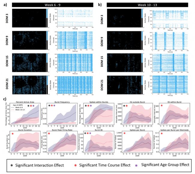 a,b) 第6–9周與10–13周類器官在MEA上的發放圖譜與活動面積。